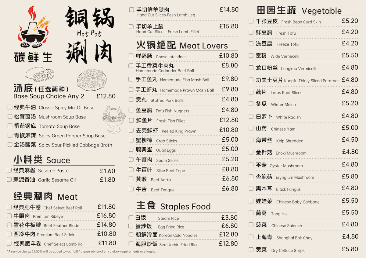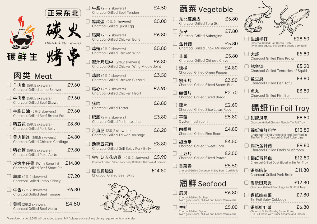 As one of the most significant food regions in China, Mr Charcoal is mainly featured by Northeast cuisine rich in varieties and tastes. Its our mission to bring the authentic northeast style of food to London. The menu of the restaurant is featured by high-quality ingredients both locally and internationally. Most of spice are imported from china for staying true to the authentic flavours of Chinese cuisine. The range of food is wide, including, BBQ skewer, table top charcoal BBQ, stir-fry, etc.